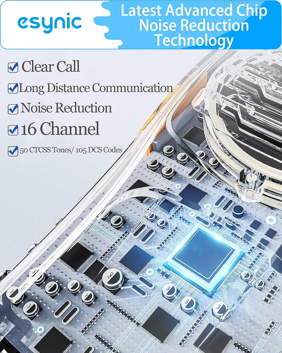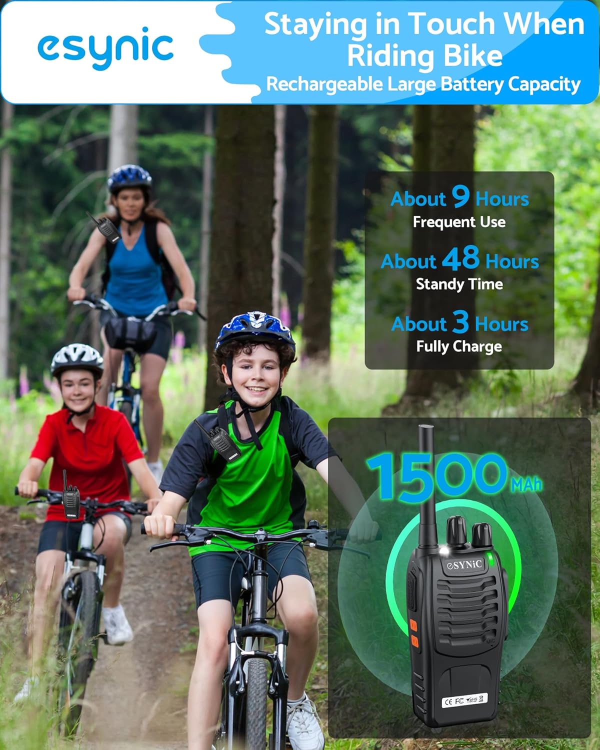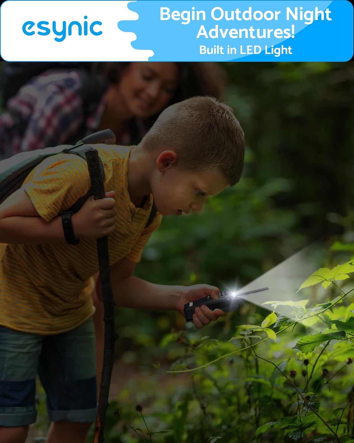 The eSynic Walkie Talkies are designed for effective communication, making them suitable for various outdoor activities. These handheld devices support VOX functionality, allowing for hands-free operation. With 16 channels available, users can easily switch frequencies to avoid interference. The built-in LED light adds convenience for nighttime use.