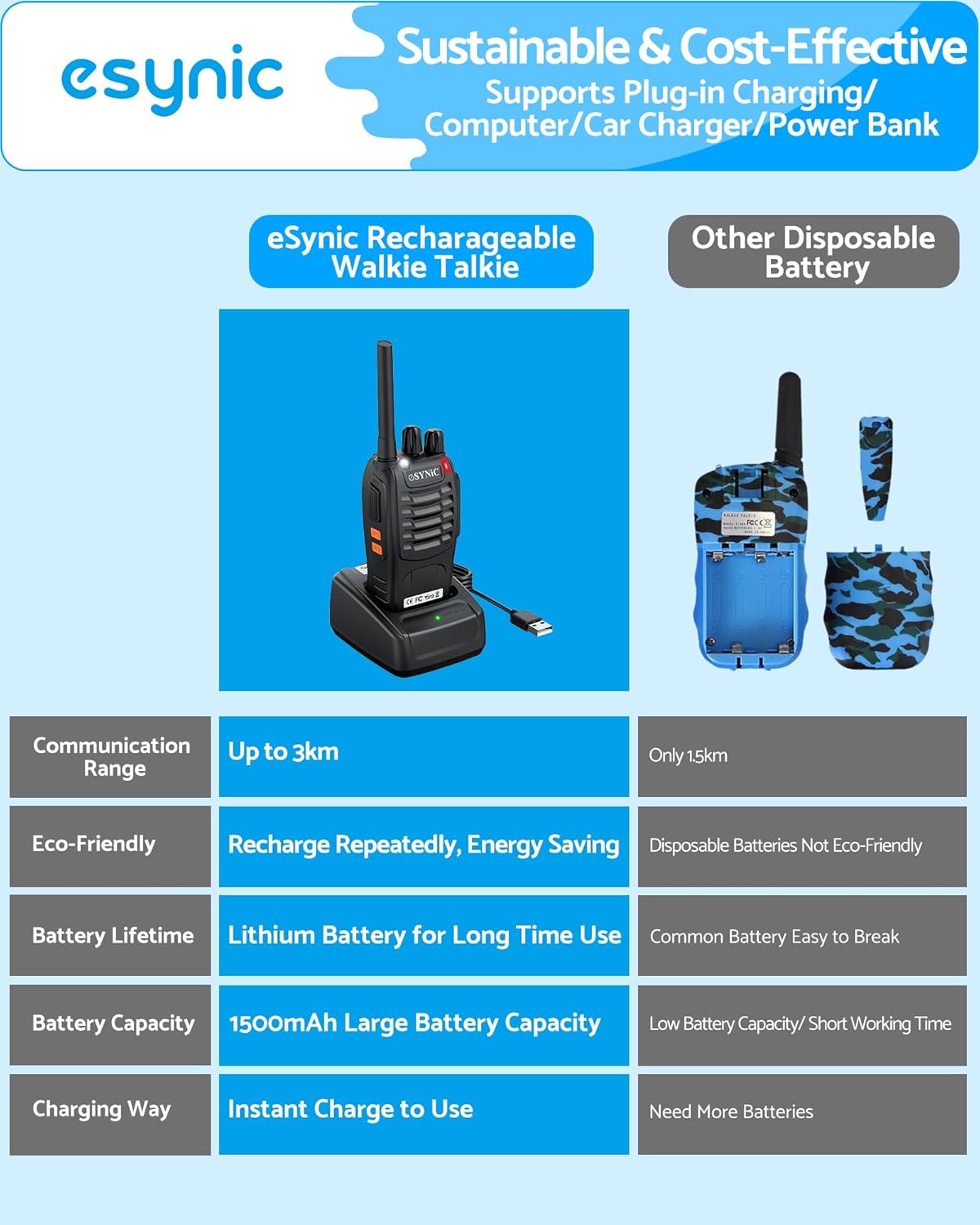 Yes, the eSynic walkie talkies are rechargeable, making them convenient for extended use.