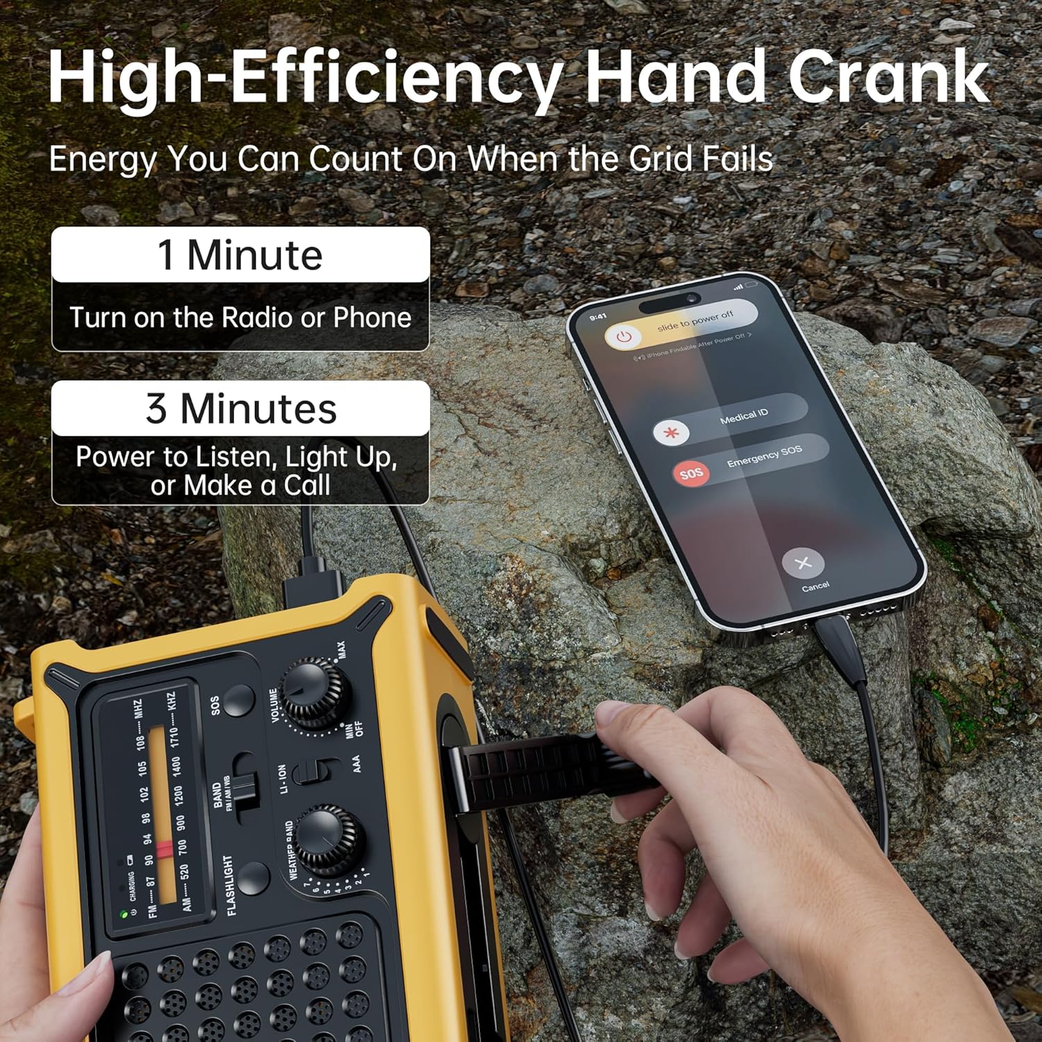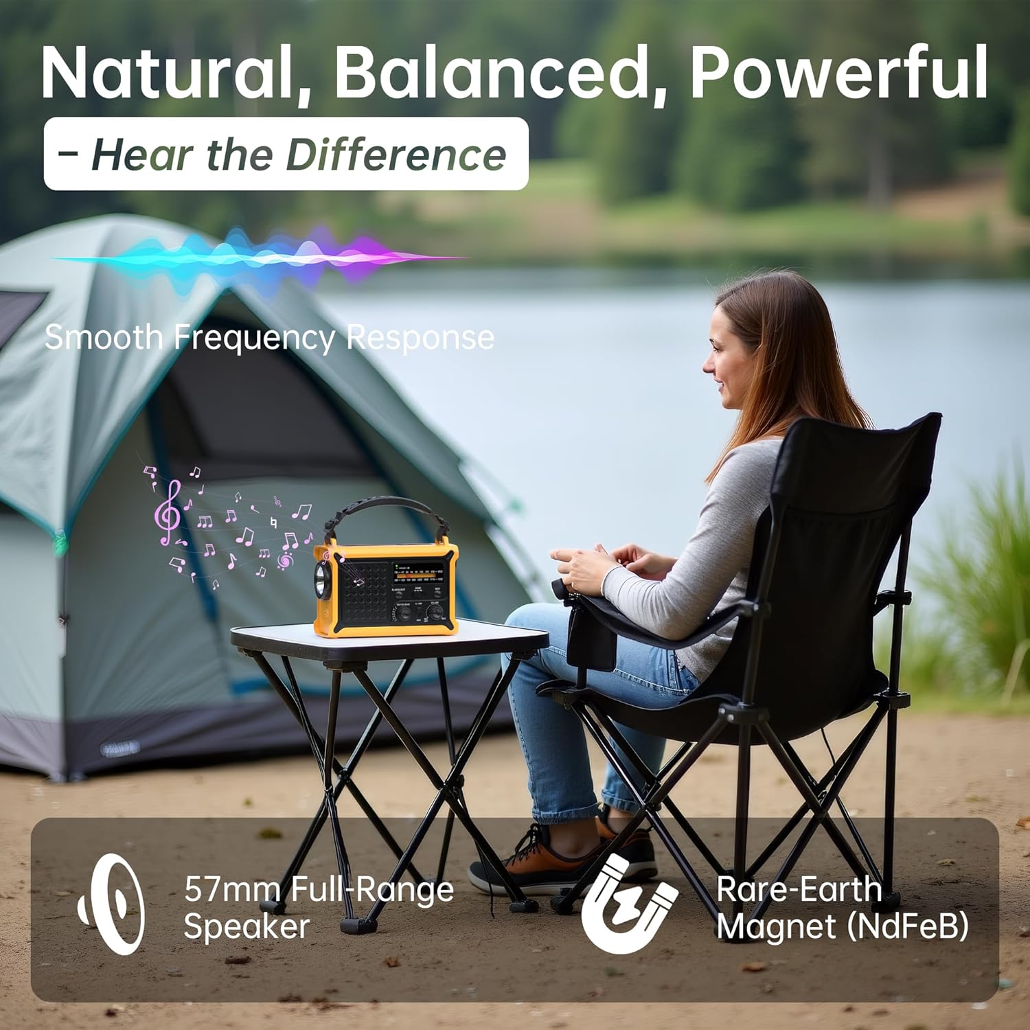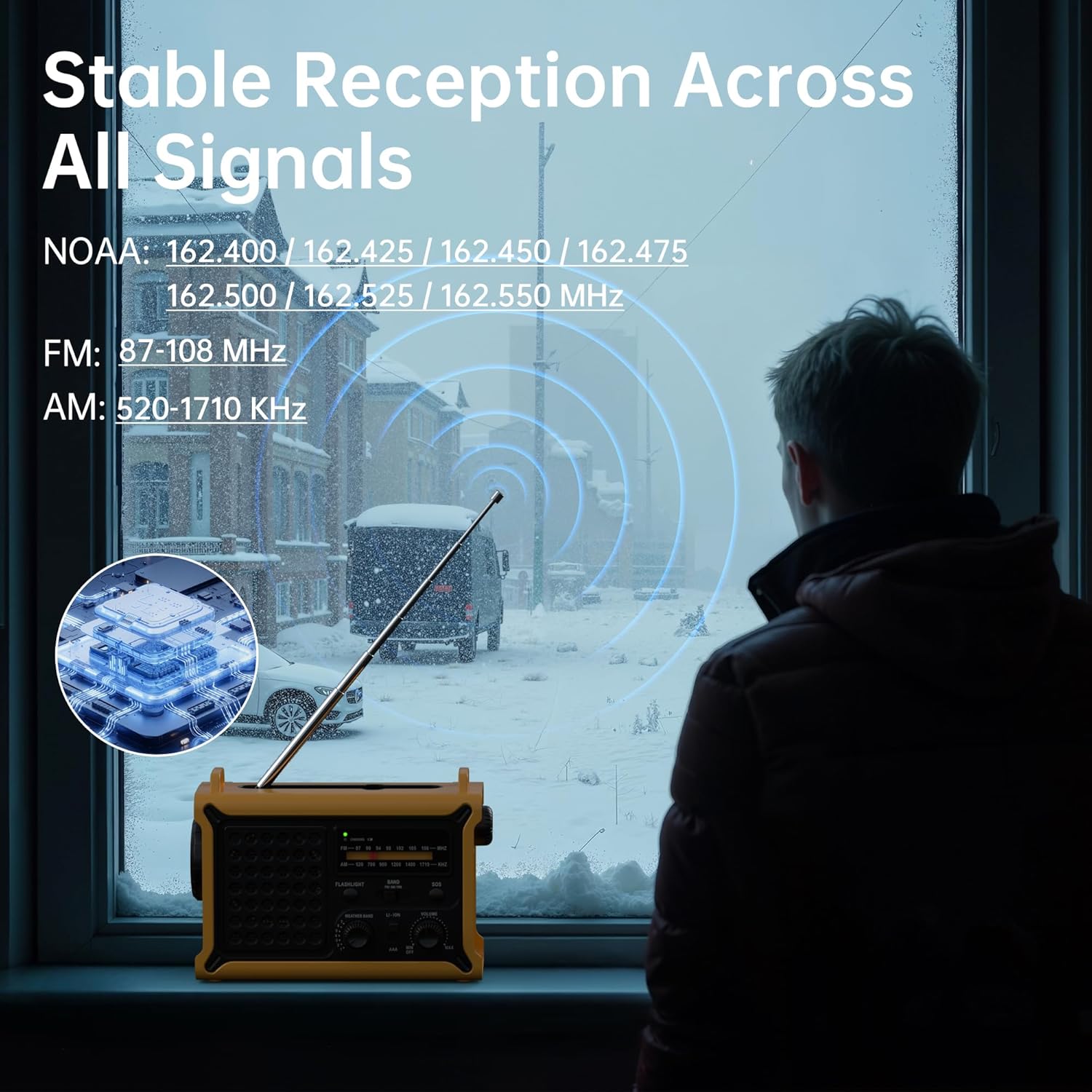 The Weather Radios Portable AM FM NOAA Alert is designed for reliable communication during emergencies. It features a robust battery backup of 12000mAh, ensuring you stay connected when it matters most. This radio is equipped with multiple charging options including solar power, hand crank, and USB, making it versatile for outdoor use. Additionally, it includes a flashlight and reading lamp, enhancing its functionality for camping or home use.